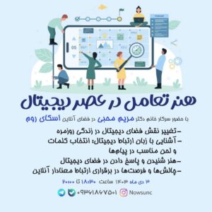 تعامل در عصر دیجیتال ارسال شده توسط javidan دسته بندی روزنشینی ها تاریخ سپتامبر 23, 2025 نظرات 0 نظر javidan مطلب قبلی جلسات خرداد ماه 1404 سپتامبر 23, 2025 مطلب بعدی جلسه زن در شاهنامه فردوسی اکتبر 15, 2025 ممکن است همچنین دوست داشته باشید جلسات خرداد ماه 1404 سپتامبر 23, 2025 روز نشینی اردیبهشت 1404 سپتامبر 16, 2025 دوره های بهار 1404 سپتامبر 14, 2025