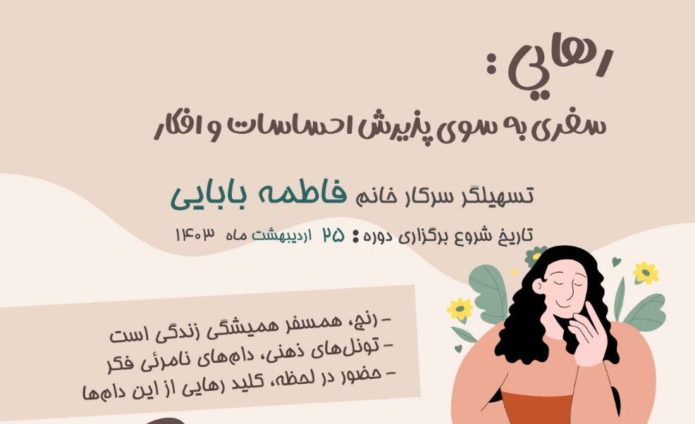 “سفری به سوی پذیرش و رهایی—جایی که افکار و احساسات شما در مسیر آرامش شکوفا میشوند. همراه ما باشید در تجربهای نو از آگاهی و هنر. 🌿🎨 📅 تاریخ: 🪷پنج شنبه ۲۵ اردیبهشت اولین جلسه (حضوری )دوره رهایی 🪷پنج شنبه ۱ …